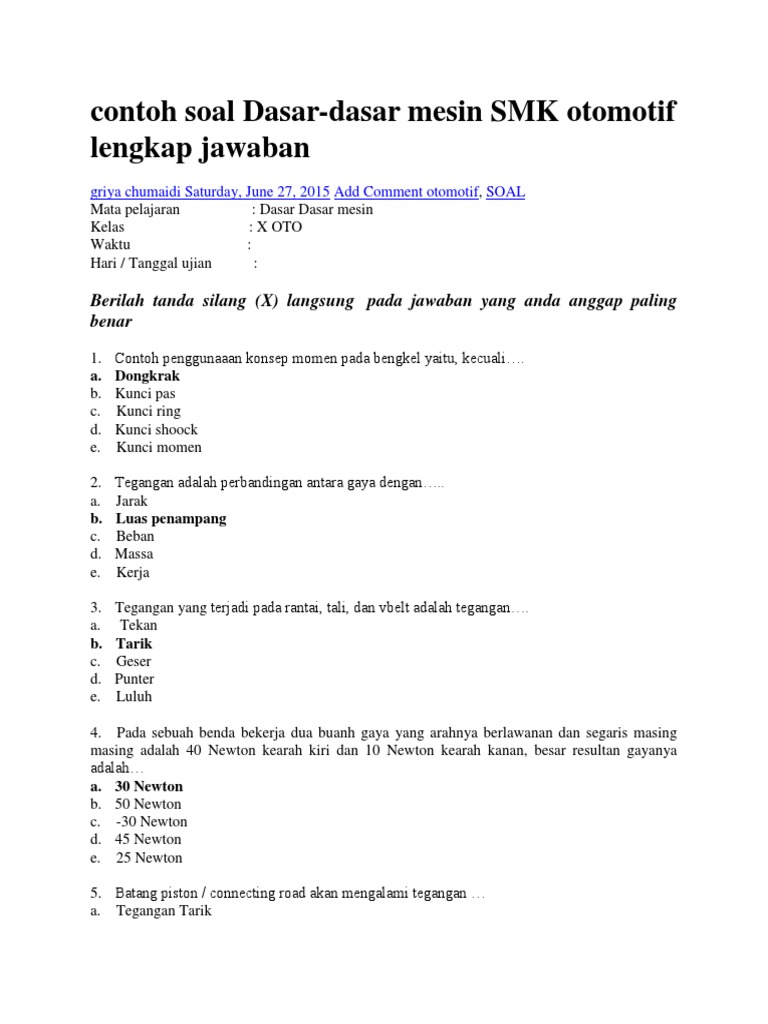 Contoh Soal Pekerjaan Dasar Teknik Otomotif Kelas 10 Semester 2 Inputsoal Com from www.inputsoal.com Maybe you would like to learn more about one of these? Soal dan jawaban pekerjaan dasar teknik otomotif. We did not find results for: Check spelling or type a new query.